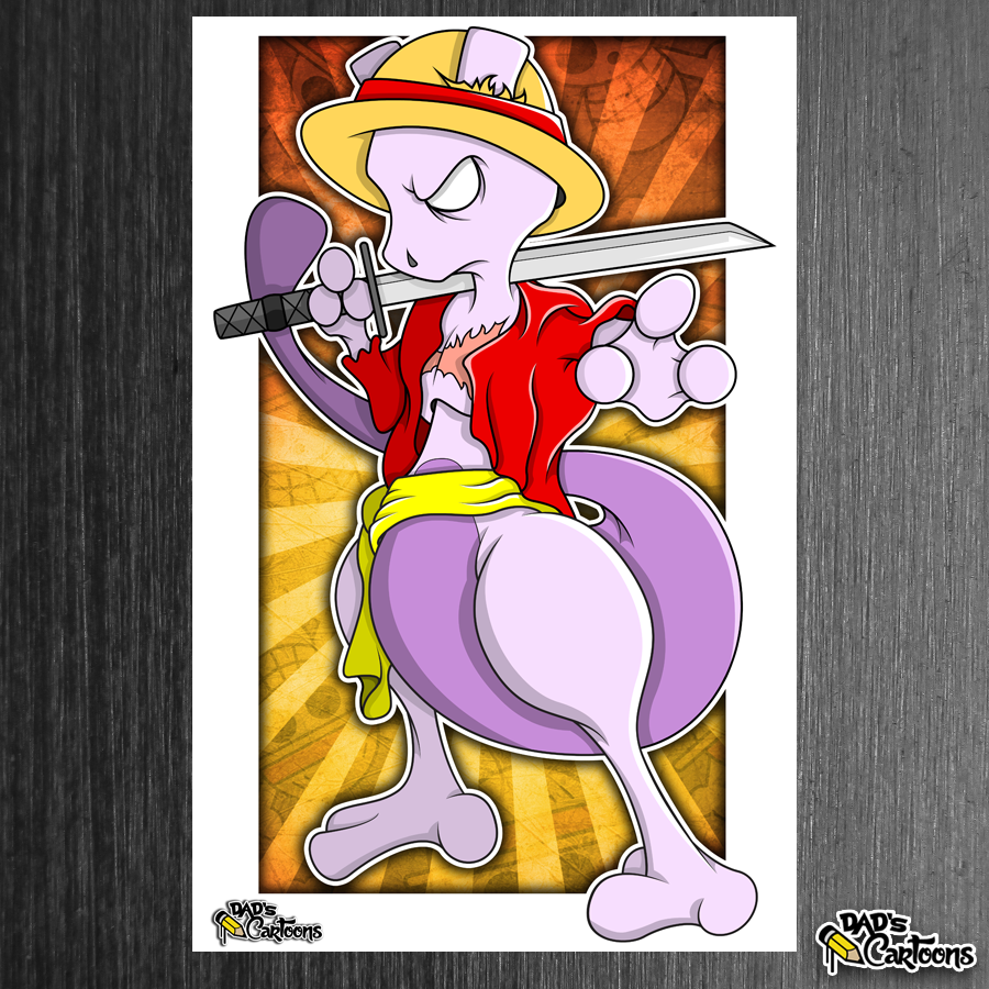 Pokemon's Mewtwo cosplaying as Luffy from One Piece on an 11x17 print on heavy duty cardstock.